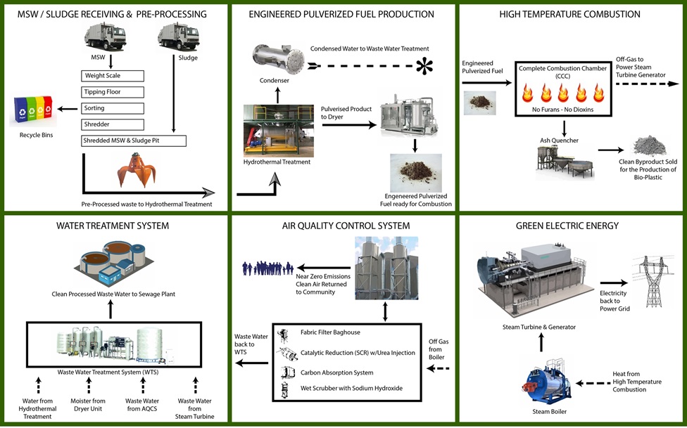 The Hydrothermal processing system, known as the Resource Recycling System (“RRS”), was originally developed by Hokuto Kougyo Co of Japan, one of the key partners of Aurutris, for the disposal of hazardous hospital (red bag) wastes and the patented production of a wood powder, used for the manufacturing of Bio Plastic. The Complete Combustion Chamber system (“CCC”), a technology developed by Jasper in Germany, another key partner of Aurutris, is used for the combustion of processed waste such as MSW, biomass and industrial wastes. The Resource Recycling System generates waste water which must be treated before discharge to a municipality wastewater treatment plant. The Waste Water Treatment System (“WWTS”) is a technology developed by ETC of South Korea, for the treatment of industrial wastewater. Aurutris also incorporates other conventional equipment for receiving, sorting, shredding and storing MSW/sludge prior to the Hydrothermal treatment and combustion of the Engineered Pulverized Fuel (EPF), as well as conventional heat recovery and steam turbine equipment for recovering useful energy from the combustion process. A highly advanced air quality control system is also incorporated.