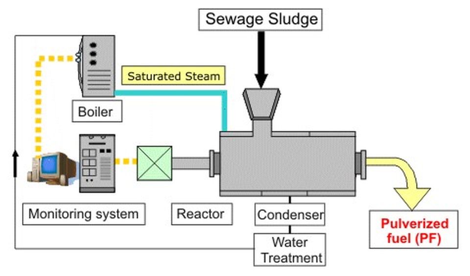 The system allows to rehash sewage sludge efficiently and usefully to solid fuel. By use of steam and pressure the sludge will be converted to pulverized fuel. Reusable material (e.g. metal, glas, rubber) will be cleaned and separated